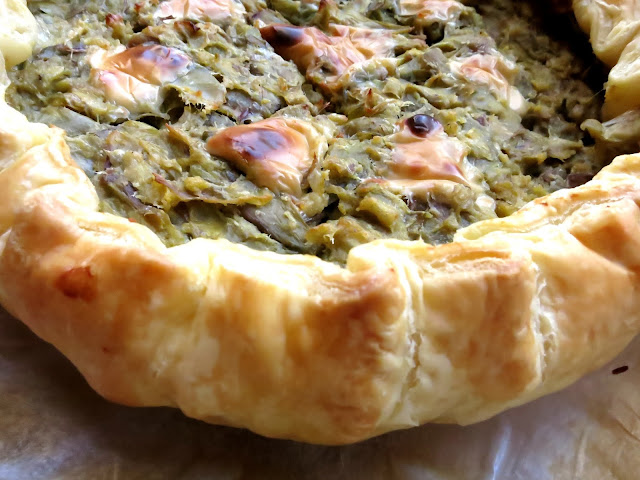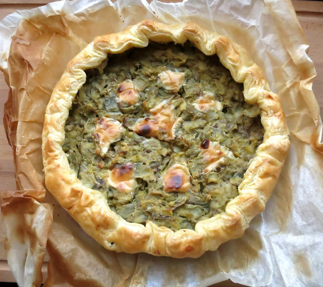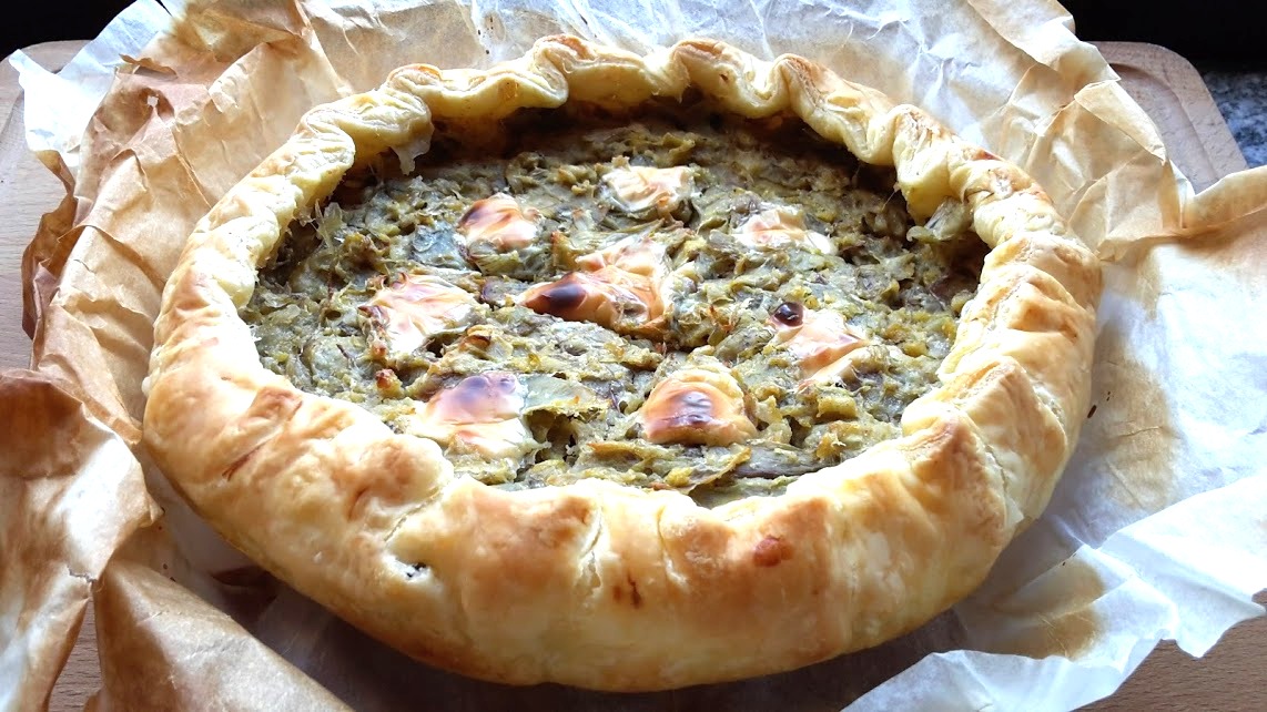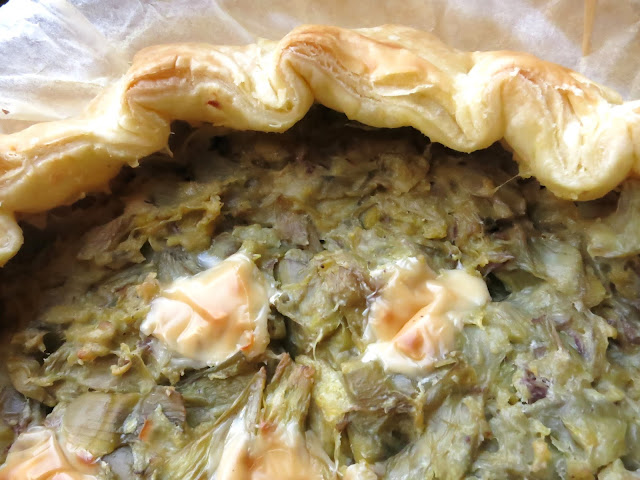 Punzecchiare con una forchetta la pasta sfoglia quindi versare e livellare i carciofi…
