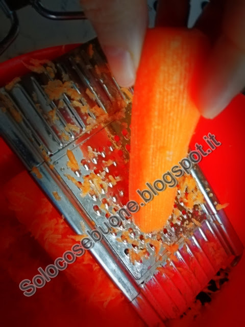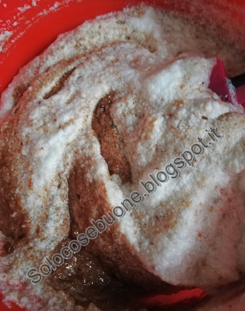 Montiamo gli albumi a neve . Uniamo alla farina di mandorle il cacao, i tuorli con lo zucchero, il bicarbonato, le carote e per ultimi gli albumi, delicatamente dal basso verso l’alto.