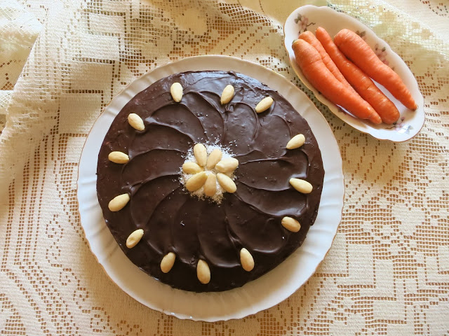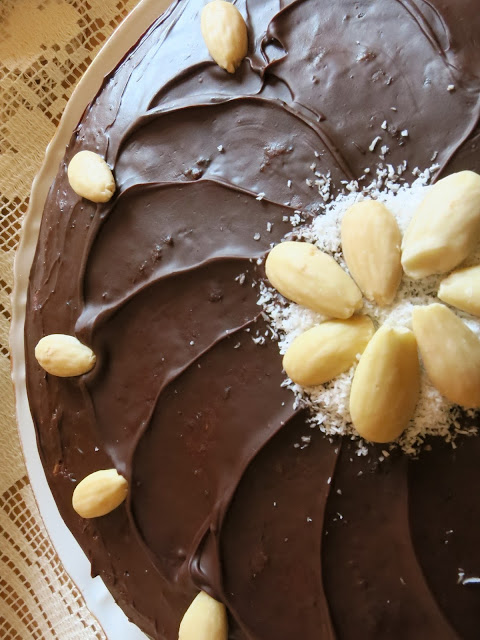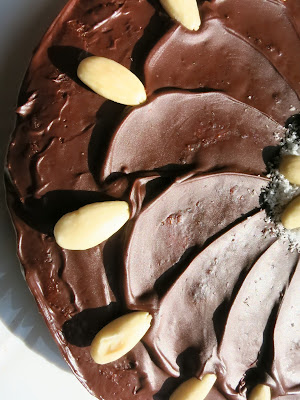 Quando il dolce sarà freddo spatolarne la superficie come appare in foto e far aderire le mandorle per la decorazione mentre il cioccolato non si è ancora consolidato..