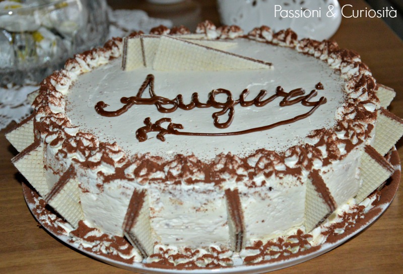 Montare la panna, ricoprire la torta, decorarla con ciuffi di panna e wafer, alla fine spolverare con polvere di cacao e fare la scritta con la nutella.