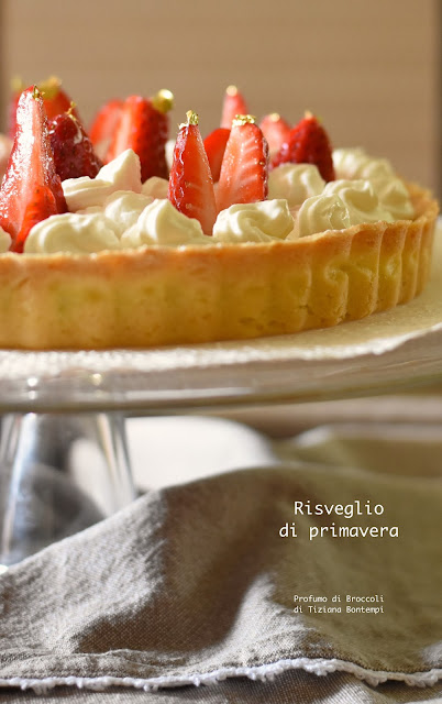 Abbiamo un guscio di frolla aromatizzata al limone; uno strato di composta di fragole; uno strato di ciuffi di crema alla vaniglia, fatta con yogurt greco e panna montata; uno strato di fragole tagliate a quarti e posizionate volutamente in modo un pò casuale, in piedi e con le punte verso l’alto che sembrano voler spiccare il volo; una cascata di oro in foglia edibile; una spolverata di zucchero a velo per decorare e che consente di omettere la gelatina sulla frutta.