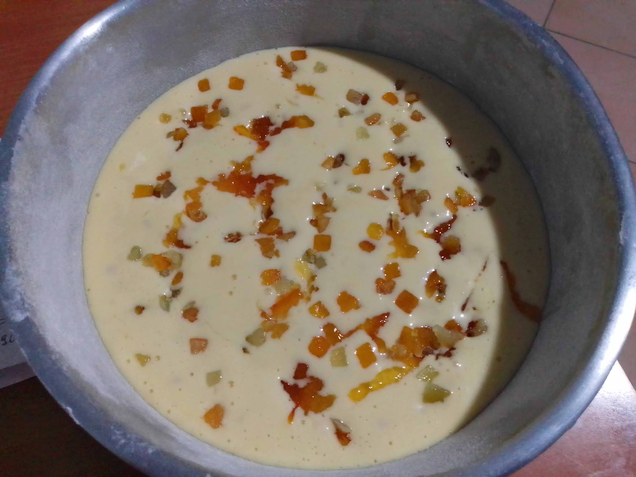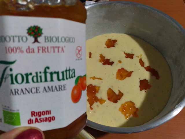 Versare metà del composto nello stampo precedentemente oliato e infarinato, aggiungere con un cucchiaio metà Fiordifrutta Arance Amare
