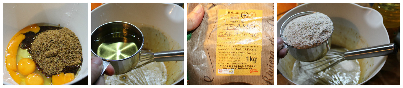 In una ciotola capiente sbattete con una frusta le uova con lo zucchero, unite l’olio e mescolate. Aggiungete gli ingredienti secchi e amalgamate sempre con la frusta.