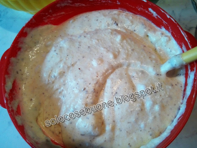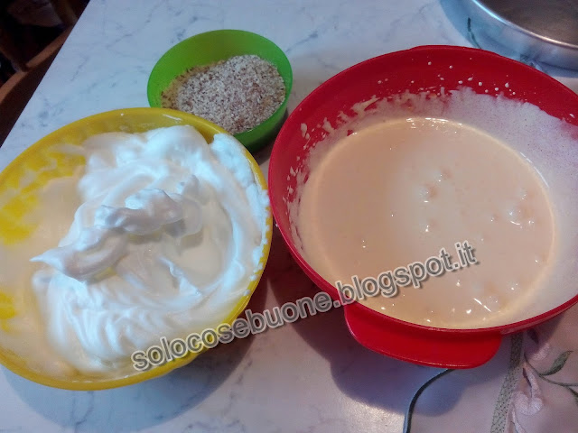 Montare gli albumi a neve e delicatamente dal basso verso l’alto unirli ai tuorli con le mandorle. Amalgamare bene il tutto.