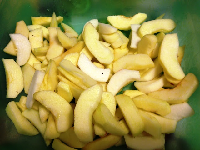 - sbucciare e affettare le mele e metterle in una ciotola con il succo di un limone per non farle annerire
