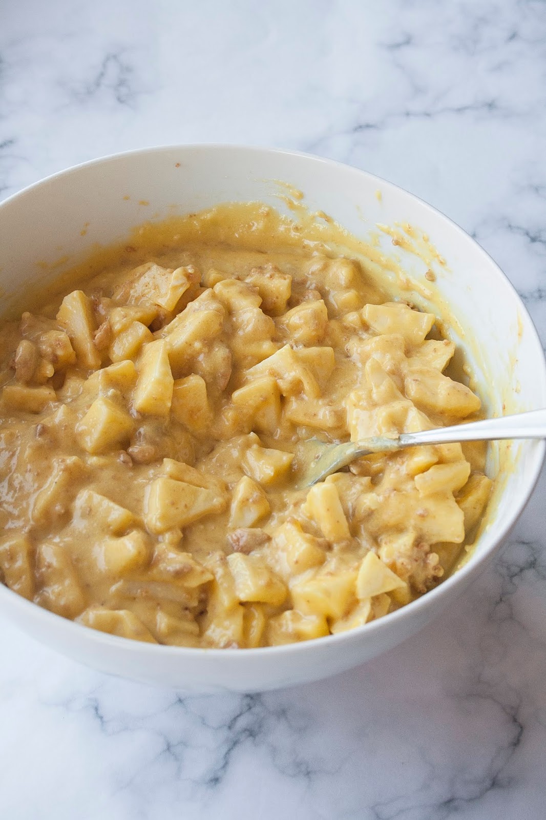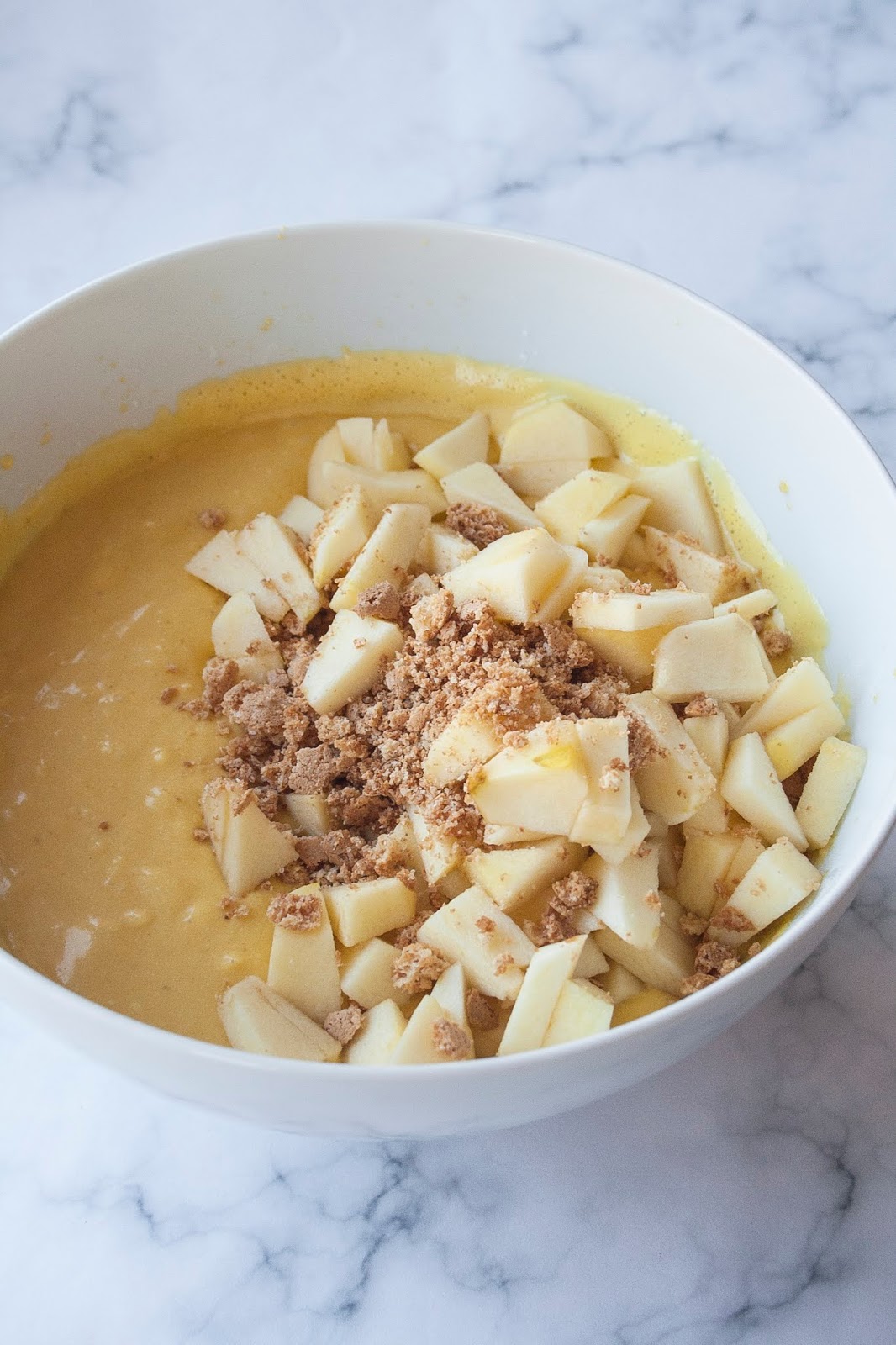 Mescolate l’impasto per bene e poi aggiungete le mele e gli amaretti.