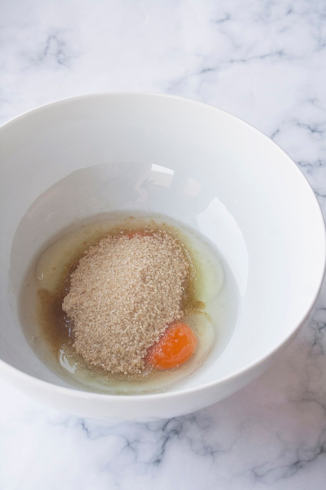 In una ciotola capiente lavorate con lo sbattitore le 2 uova con lo zucchero di canna fino ad ottenere un composto spumoso.