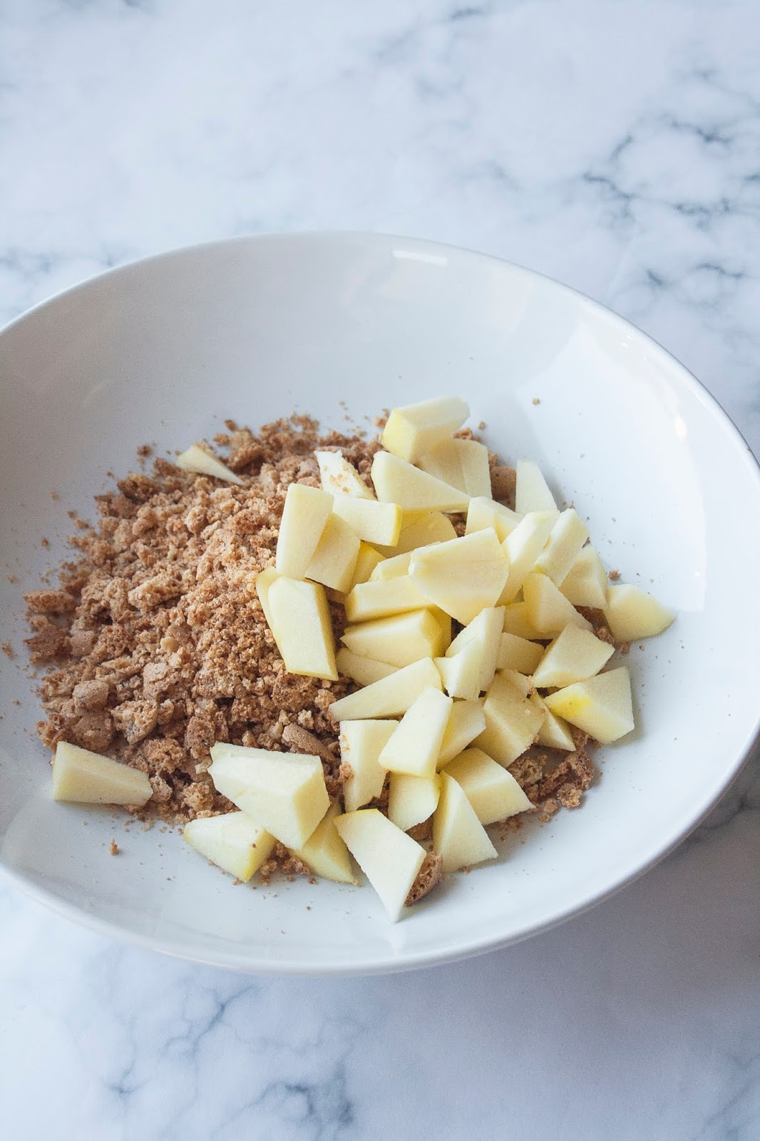 Sbriciolate gli amaretti in una terrina e poi tagliate le mele a cubetti dopo averle private della buccia e del torsolo e mettete il tutto da parte.