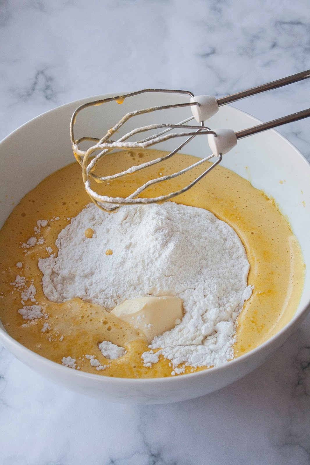 Continuando a mescolare, unite la farina di tipo 2, la maizena, la vanillina, 1 cucchiaino di liquore all’amaretto, il burro morbido, il latte e infine il lievito in polvere.