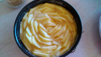 In una ciotola versate prima le uova e lo yogurt, amalgamate e poi versate tutti gli altri ingredienti ad eccezione delle mele. Lavorate energicamente con una frusta l’impasto che alla fine dovrà risultare liscio e spumoso ( volete potete utilizzare anche un robot ). Infine aggiungete le mele a cubetti e versate tutto in una tortiera da 24 cm imburrata ( la mia era da 20 cm e infatti la torta è venuta bella alta). Disponete sulla superfigie le mele a fettine e cospargetele con un cucchiaio di zucchero di canna tolto dal totale.