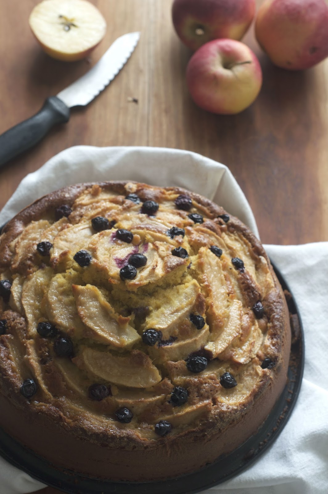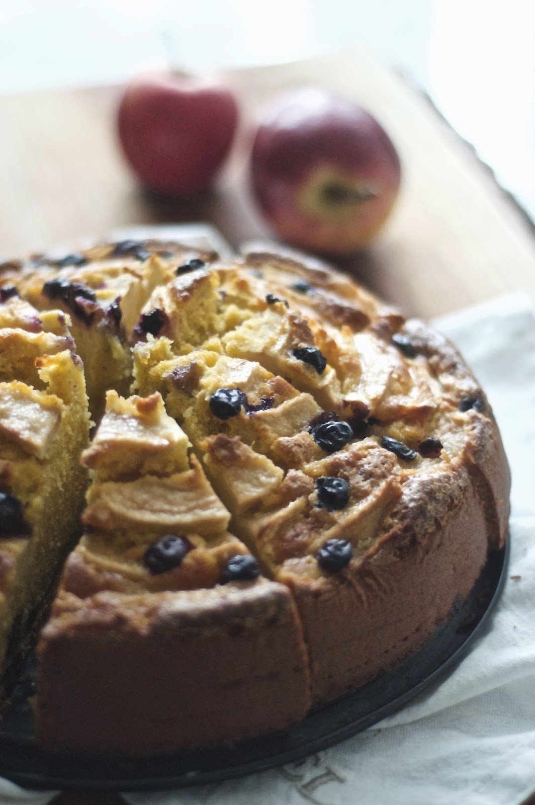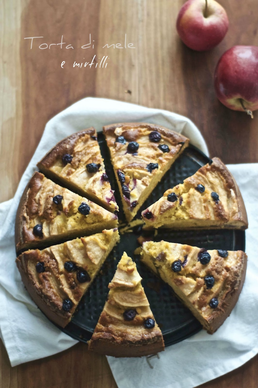 Nell’impasto ho tolto il burro e messo l’olio che la rende più soffice e umida, ho aggiunto la polpa di mela frullata e per rendere il tutto ancora più goloso mirtilli dentro e fuori con una bella spolverata di zucchero di canna.