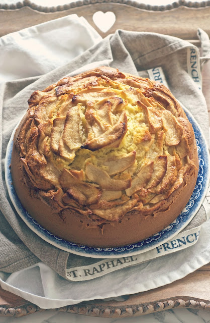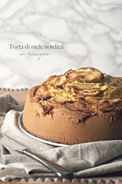 Soffice, leggera e umida, con una montagna di mele in superficie, una variante con l’aggiunta del mascarpone che è uno spettacolo per gli occhi e per il palato.