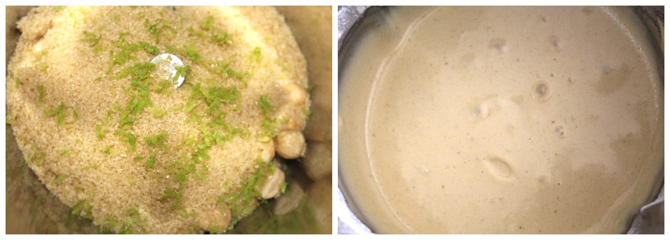 Tritate per 30 secondi la scorza grattugiata del limone con le nocciole e lo zucchero alla massima potenza. (bimby, 30 sec. vel. turbo)