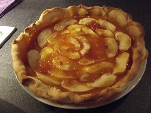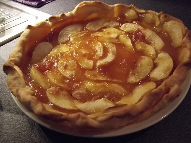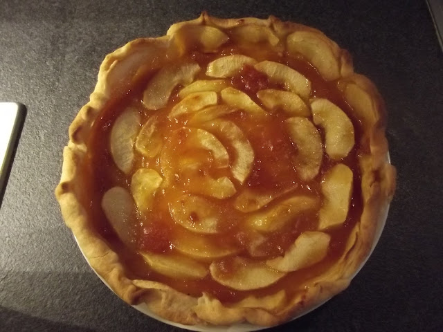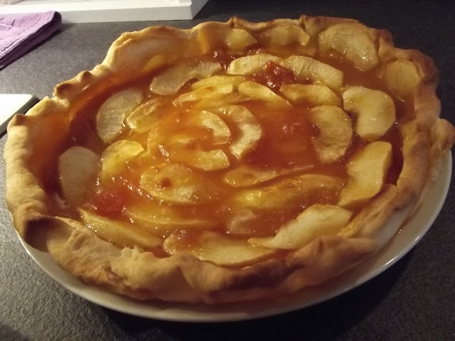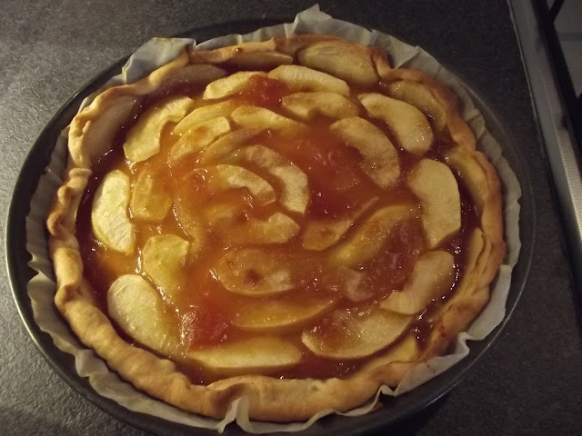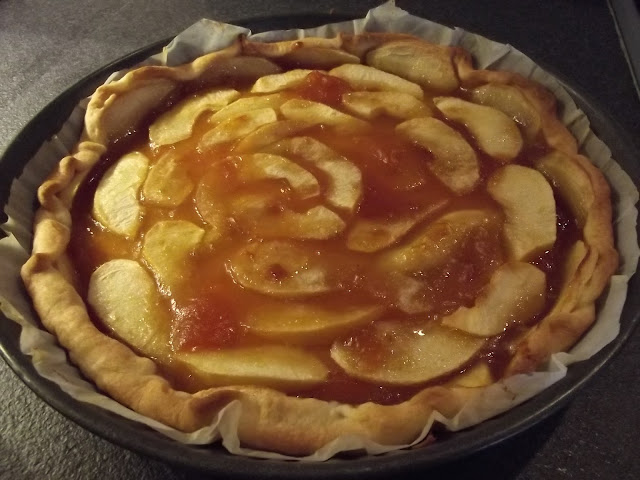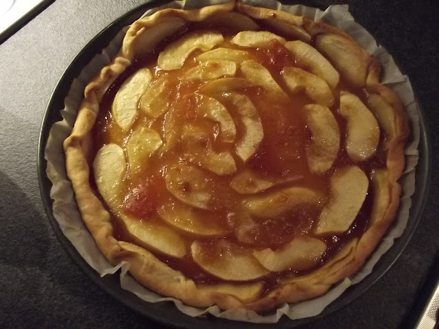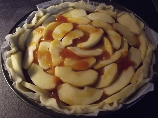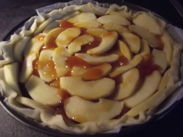 Nel frattempo lavate, sbucciate e tagliate a fettine le mele, sistemate le fettine sulla pasta brisee’, infine spennellate con altra confettura.
