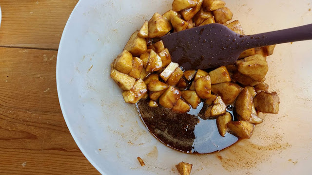 Mettete le mele in una boule con lo zucchero e le spezie. Mescolare. Lasciare riposare per mezz’ora mescolando spesso. In un altro contenitore setacciate la farina assieme al bicarbonato e al sale.