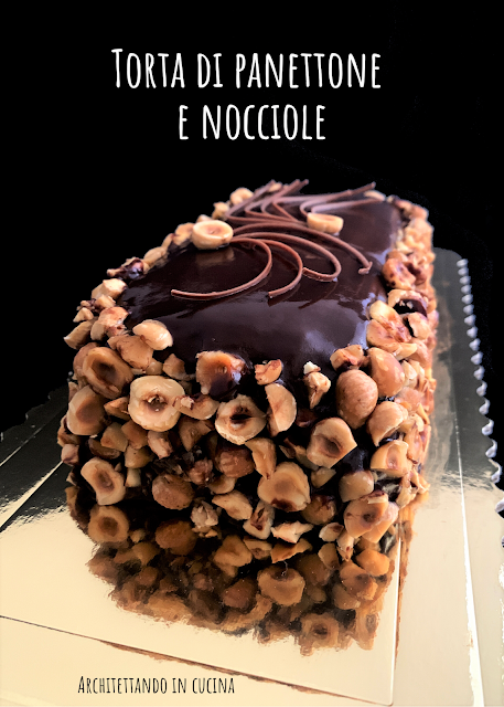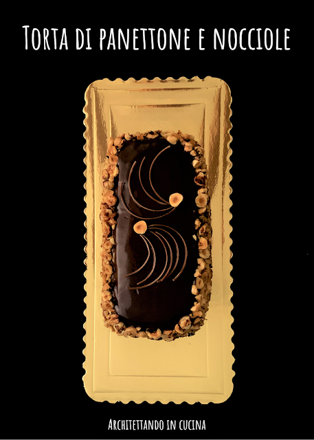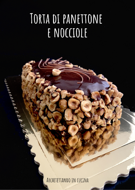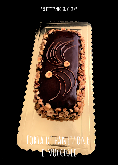 Così ho realizzato una torta a strati utilizzando il panettone classico fatto a fette, al posto del pan di spagna, l’ho bagnata con una bagna al caffè di Leonardo Di Carlo, farcita con la crema diplomatica di Mélanie Dupuis e glassata con la glassa fondente a specchio di Massimo Pica. Per decorare ho ricoperto il bordo di nocciole spezzate grossolanamente e riccioli di cioccolato fondente.