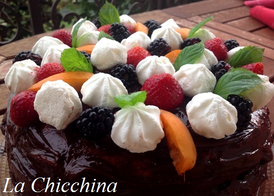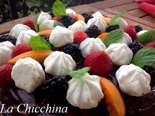 Lavorare la Nutella con la ricotta e rivestire la torta. Decorare la superficie con le meringhette, i frutti e le foglie di menta. Per essere al meglio deve riposare anche quattro ore in frigo. Auguri al mio Renzo….e baci a voi!!!