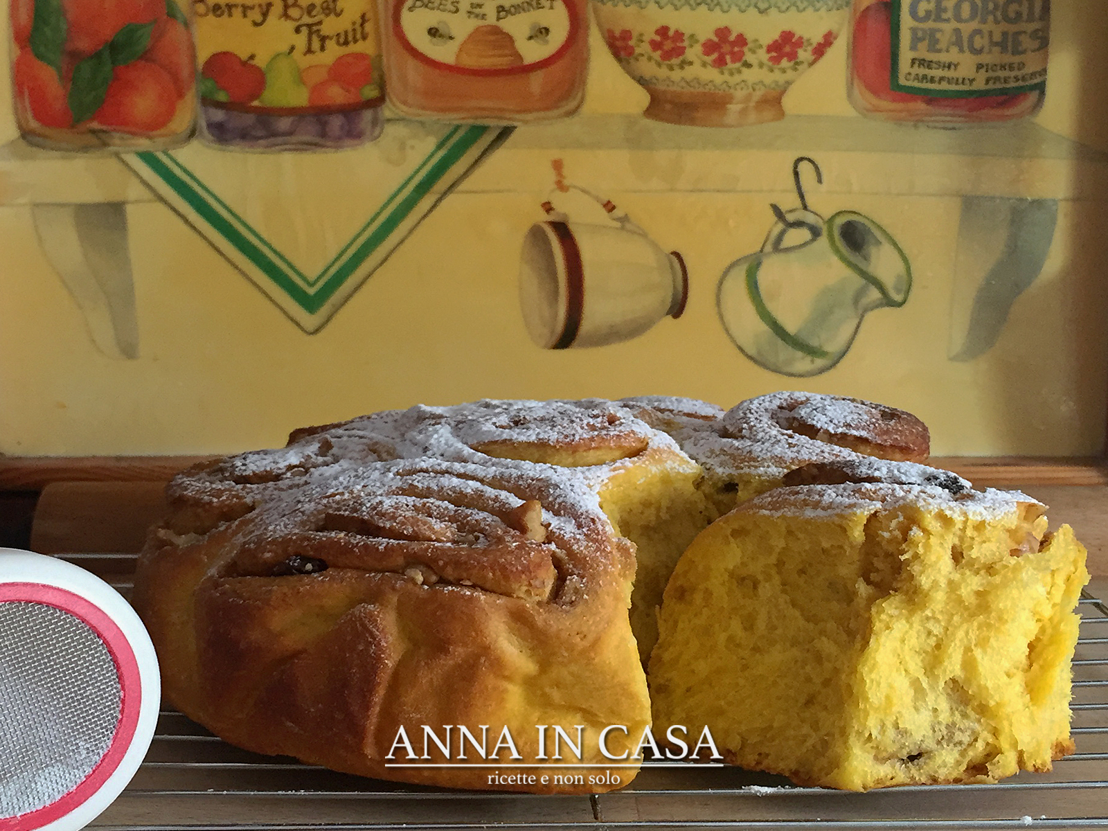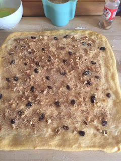 Spennellare tutta la superficie della pasta lievitata con il burro fuso; cospargere con l’uvetta precedentemente strizzata e tamponata con carta cucina, con le noci tritate grossolanamente, con lo zucchero e con la cannella a piacere.