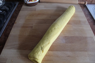 Tagliare dei tronchetti alti circa 4-5 cm, sigillarli bene nella parte inferiore e sistemarli in una teglia foderata con carta forno, lasciando dello spazio fra una rosa e l’altra. Lasciare lievitare coperta da pellicola trasparente o da una cuffia da doccia ( mio trucco x una lievitazione migliore :) ancora per circa 1 ora.