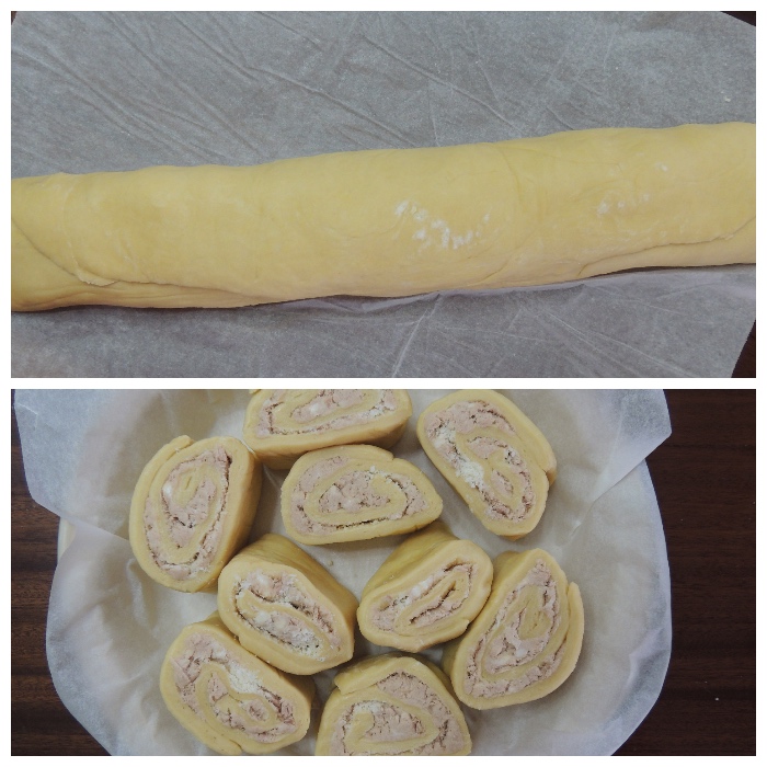 - Arrotoliamo delicatamente l’impasto, poi tagliamo delle fette piuttosto spese e disponiamole in teglia, così come si vede in foto. Un poco distante le une dalle altre e lasciamo lievitare ancora per una trentina di minuti.