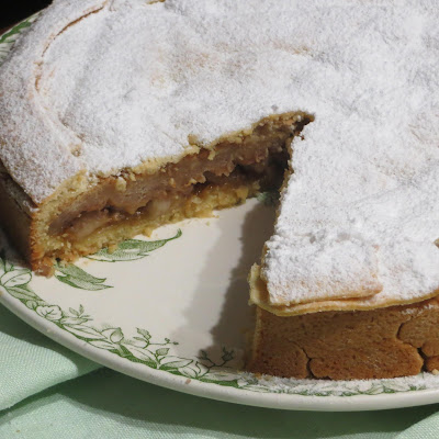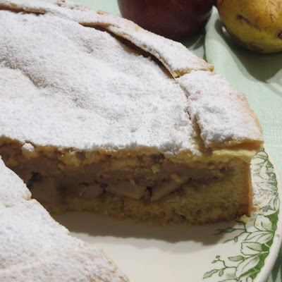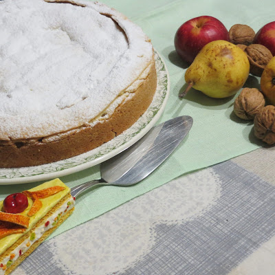 La torta di oggi è una sfiziosa crostata ripiena di frutti autunnali pere, mele, noci e uvetta, è la torta tradizionale di casa che veniva preparata per San Martino, insieme alle castagne bollite con le pere “nobili”.