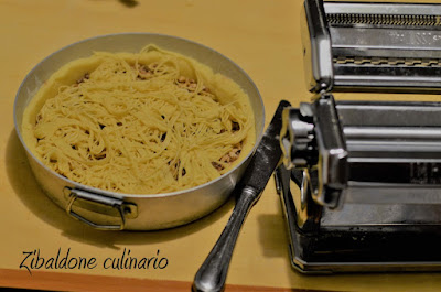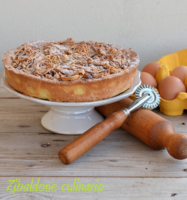 Con la frolla foderare una teglia da 22cm di diametro, forare il fondo con la forchetta, cospargere con una parte di tagliatelle, una parte di farcia, e qualche fiochetto di burro. Procedere così alternando gli strati, finire con i fiocchi di burro e una leggera spolverata di zucchero semolato.