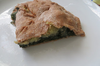 Impastare la sfoglia e lasciarla riposare qualche minuto. Nel frattempo lessare le patate, sbucciarle e schiacciarle con lo schiacciapatate. Lavare la borragine ed eliminare le parti più dure, tagliarla a striscioline e lessarla. Stendere mezzo impasto su un foglio di cartaforno. Distribuirvi la borragine (senza acqua di cottura), salare e distribuirvi le patate schiacciate e mescolate con un pizzico di sale e pepe. Stendere l’altra metà dell’impasto e coprire le verdure, far aderire i bordi, ritagliare la sfoglia in superficie per evitare che si gonfi in cottura. Cuocere in forno a 220° per 30 minuti.