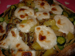 Impastare la sfoglia e lasciarla riposare qualche minuto. Nel frattempo spuntare i fagiolini, spezzettarli e cuocerli in padella coperti d’acqua e con coperchio per 30 minuti. Di tanto in tanto rimescolarli ed aggiungere altra acqua se serve. Cuocere in pentola coperte d’acqua per 20 minuti zucchine e patate a cubetti. Unire le verdure eliminando l’acqua di cottura, aggiungere un pizzico di sale. Stendere la sfoglia su una teglia con cartaforno, distribuirvi le verdure e delle fettine di formaggio vegetale. Richiudere i bordi della sfoglia sulla farcia ed infornare a 180° per 25 minuti.