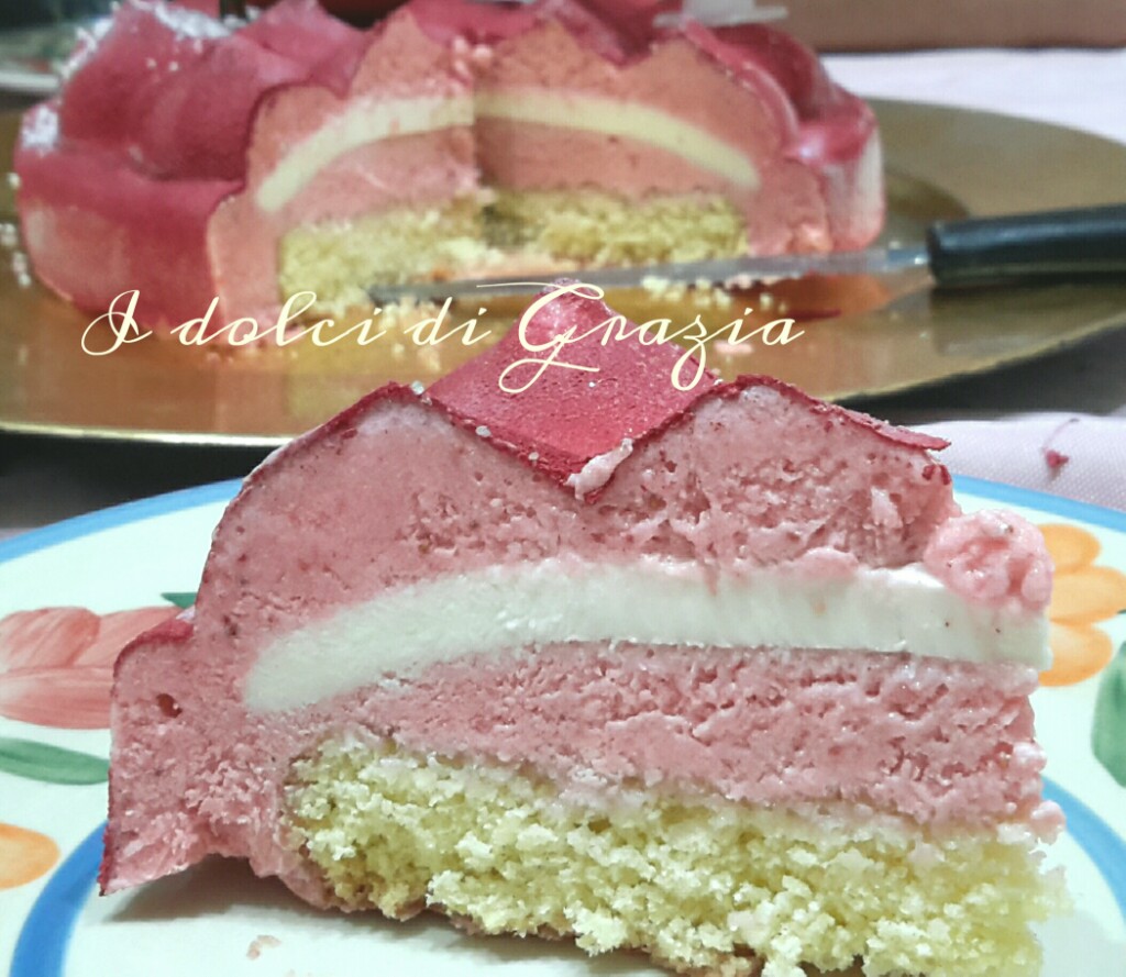 Si tratta di una torta moderna a strati. Alla base c’è un pan di spagna al cocco, ricoperto di mousse alle fragole e meringa italiana. Al centro un goloso inserto al cioccolato bianco ed, infine, uno strato di copertura di mousse alle fragole e meringa.