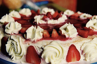 Farciamo con la mousse e con le fragole tagliate a pezzettini, ricopriamo con il secondo strato di PdS e ripetiamo.