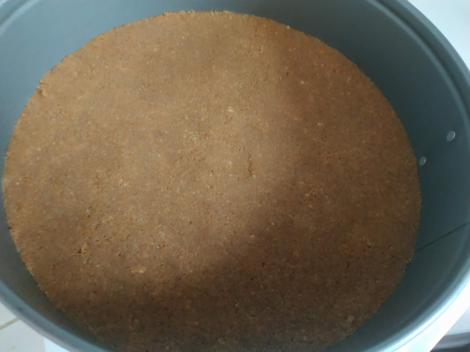 Frullate i biscotti, amalgamateli con il burro fuso e compattate il composto sul fondo di una teglia a cerniera. Mettete in frigo a rassodare.