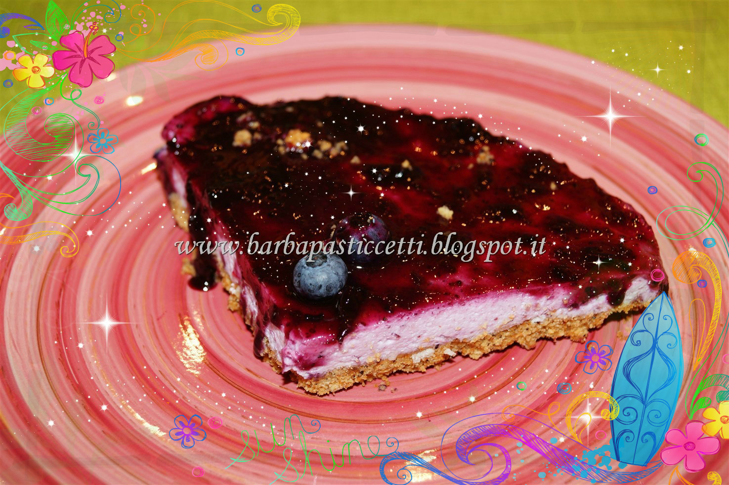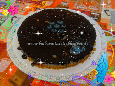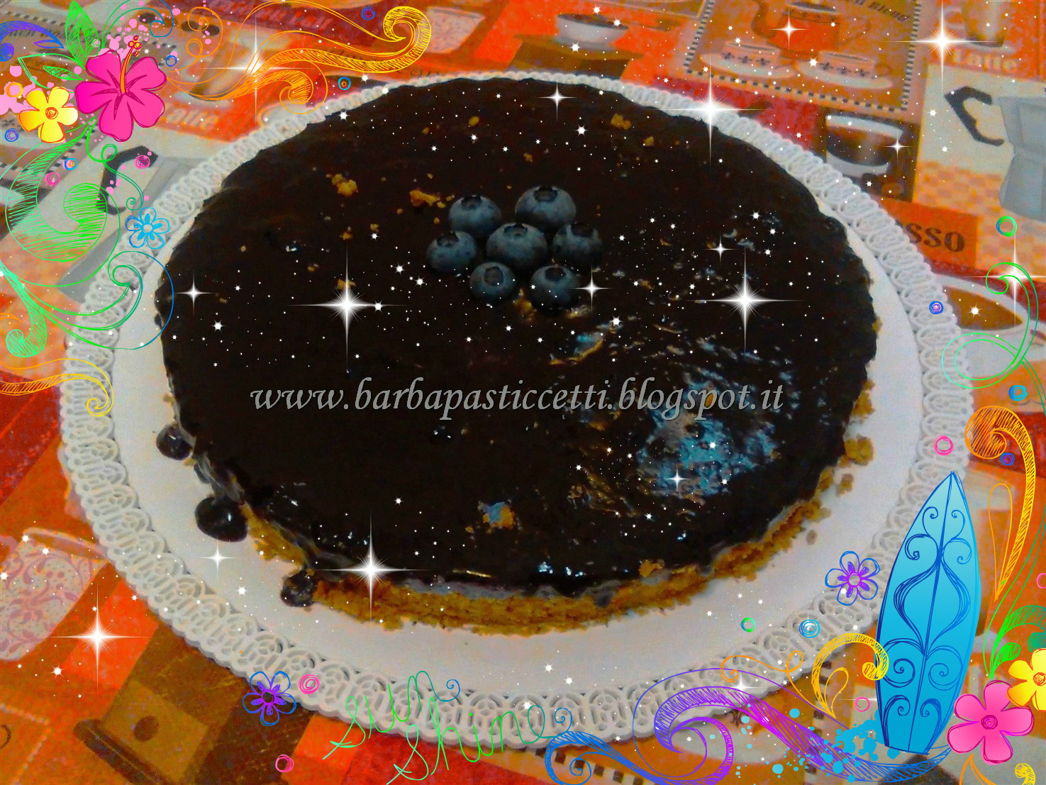 Passato questo tempo versare sulla superficie della torta tutto il sughetto rimasto stendendolo uniformemente e decorando con i mirtilli interi messi da parte.