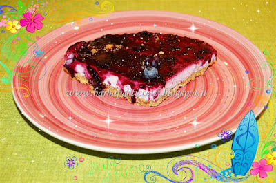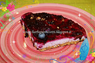 In una ciotola capiente con le frustine elettriche montare lo yogurt con il formaggio cremoso e lo zucchero a velo quindi prelevare una parte del sughetto (ancora caldo) ottenuto dai mirtilli cotti e frullati e sciogliervi molto bene dentro la gelatina precedentemente strizzata; regolarsi quindi sulla quantità di sughetto da prelevare.