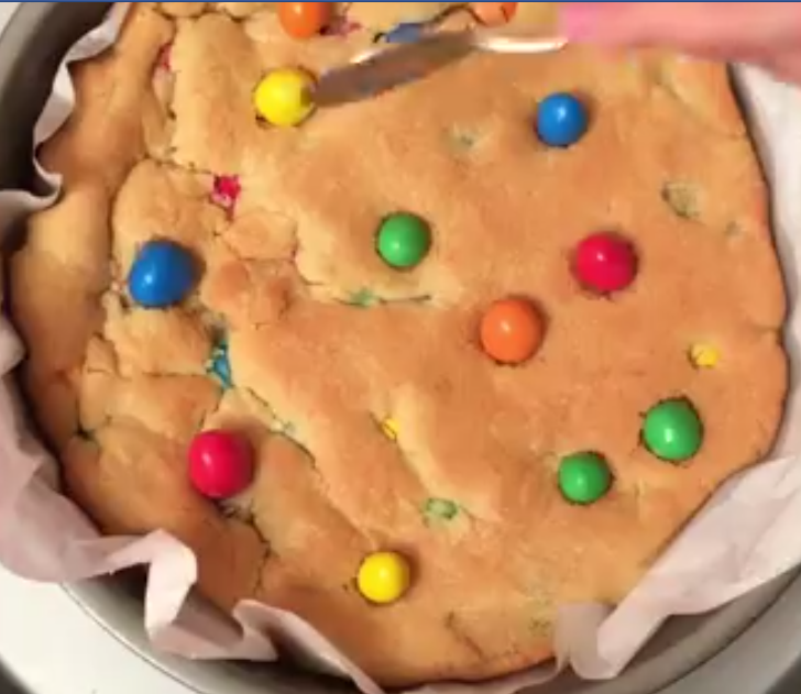 Ingredienti: 220 gr di burro a temperatura ambiente 150 gr di zucchero 160 gr di zucchero integrale di canna* 2 uova 300 gr di farina 00 5 gr di sale 5 gr di bicarbonato di sodio 1 bustina di vanillina 200 gr di M&M’s al cioccolato Procedimento: In una ciotola mescolare il burro con i due tipi di zucchero e le uova. Aggiungere un poco alla volta la farina, il sale, il bicarbonato, la vanillina e 150 grammi di M&M’s. Ricoprire con carta da forno una teglia rotonda per la pizza di diametro di 35 cm e spalmarci sopra il composto lasciandolo almeno a 2 cm di distanza dal bordo perchè si estenderà durante la cottura. Cuocere in forno preriscaldato a 190°C per circa 30 minuti. Sfornare e prima che si raffreddi decorare il biscotto gigante con gli M&M’s rimasti ..