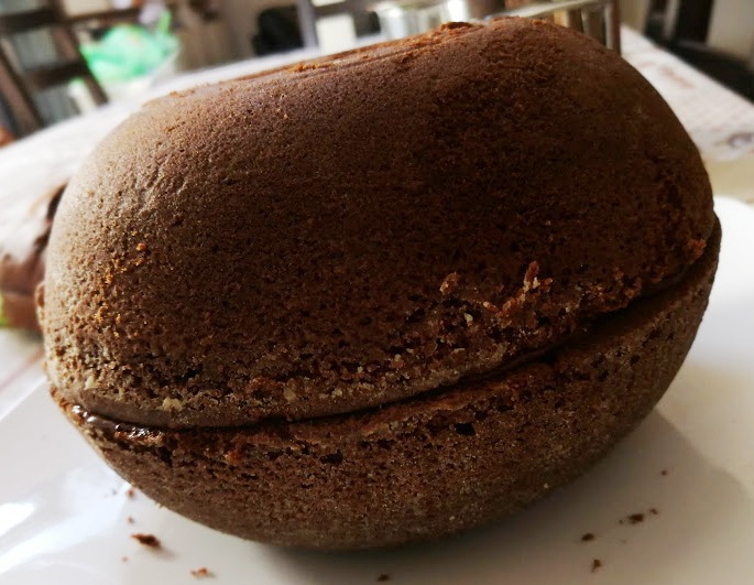Tagliare la “calotta” delle semisfere onde poterle sovrapporre per creare il corpo del gufo. Spalmare la prima calotta con la crema scura e sovrapporre la seconda calotta.