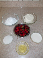 Lavare e pelare le ciliegie, privarle del nocciolo e tagliarle a pezzetti. In una ciotola lavorare con una frusta il mascarpone, lo zucchero a velo e la panna fresca liquida. Dividete il composto ottenuto in due ciotole.