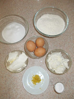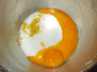 In un’altra ciotola battere i tuorli, lo zucchero e la scorza del limone; unire la ricotta, il mascarpone ed amalgamare bene con le fruste.