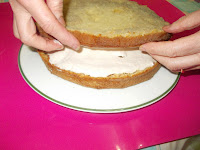 Riempire una sac à poche e farcire il primo disco di torta con la crema di ciliegie al mascarpone. Prendere il secondo disco di torta, quello della superficie superiore e capovolgerlo coprendo la base farcita in maniera tale che il coperchio della torta sia costituito dalla parte spugnosa in alto. Bagnare sulla sommità con la bagna analcolica e coprire terminando con la crema al mascarpone che era stata riposta in frigo stendendola, con una spatola, anche sui lati e riporla in frigo.