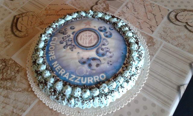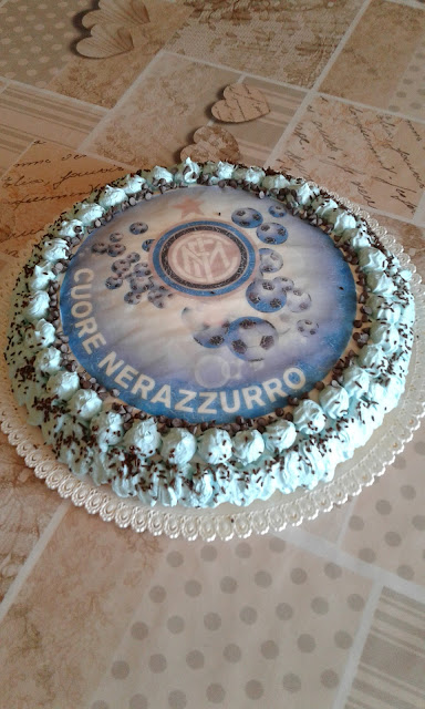 E cosi’ sabato ho preparato questa torta per festeggiare il compleanno di Gabriele in pizzeria con i suoi amici, e’ stata molto gradita e una sorpresa inaspettata. Al momento in cui il cameriere la stava portando stavano guardando la partita dell’Inter alla TV e in quel momento l’ Inter ha segnato il goal che poi e’ stato annullato, che coincidenza!!!