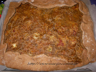Lessare le lenticchie in acqua con 2 cucchiai di trito vegetale per 30 minuti. Eliminare buona parte dell’acqua di cottura e frullarle. Aggiungere al trito il cipollotto ed i pomodorini tagliati in pezzetti, le noci e mescolare tutto. Impastare la sfoglia e stenderla su un foglio di cartaforno, adagiarla su una teglia. Farcire con le lenticchie, distribuire bene l’impasto e ripiegare i bordi sulla farcia. Cuocere a 190° per 35 minuti. Io l’ho accompagnata con delle bietole al vapore.