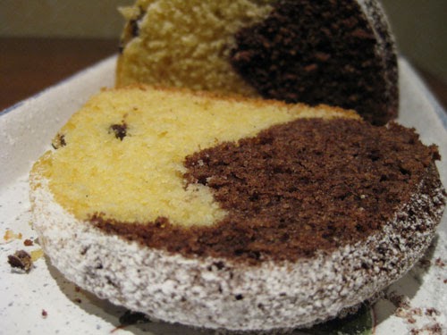 Disponete la farina a fontana sulla spianatoia e iniziate a lavorarla con le uova,lo zucchero, il liquore il latte, aggiungete poi anche 150 g di burro, il lievito e la scorza del limone grattugiata. Impastate il tutto fino ad ottenere um composto liscio e omogeneo, quindi incorporate il cacao a circa 1/3 della pasta appena preparata. Ungete una teglia col burro rimasto e stendetevi metà della pasta bianca, coprite con quella al cacao e formate un ultimo strato di pasta bianca. Infornate a 180°C fino a doratura. Servite la torta macchiata tiepida o appena raffreddata, spolverizzata con zucchero a velo, tagliata a fette.