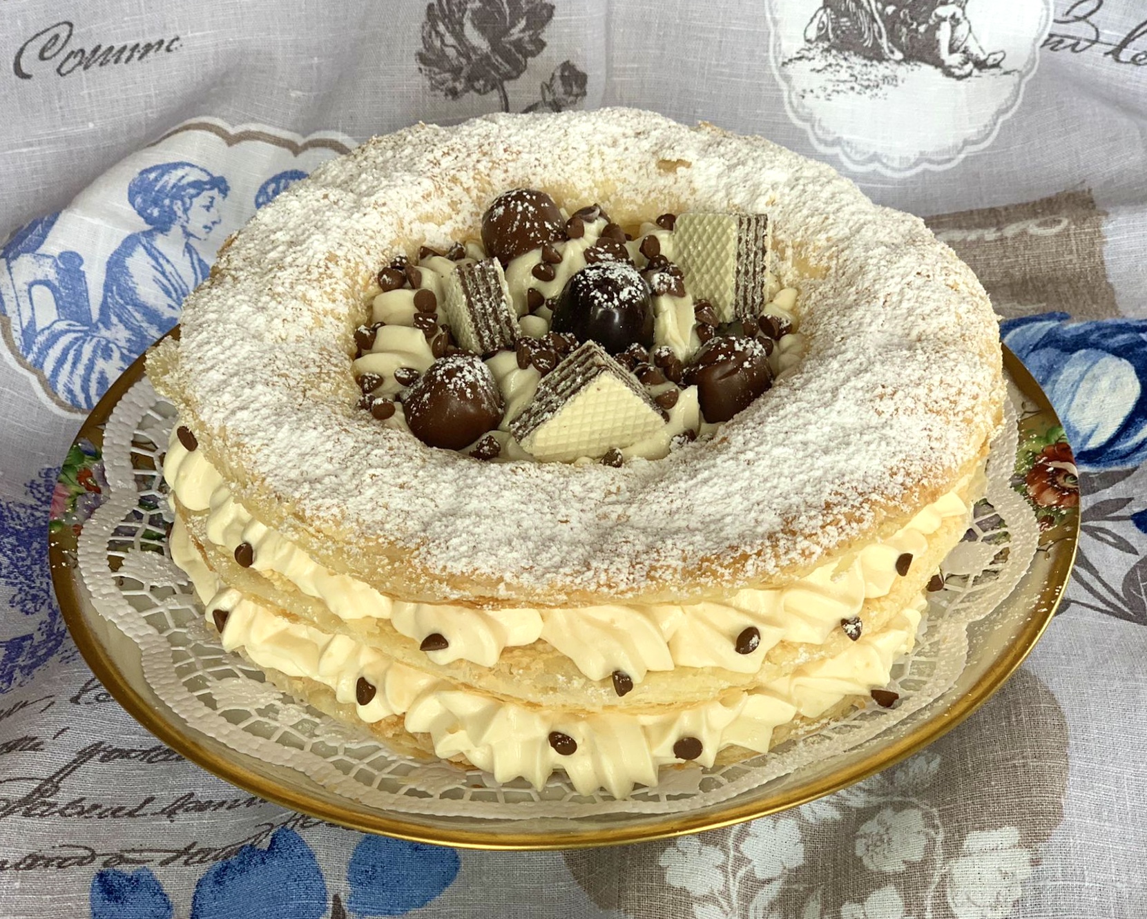 Versate un ciuffo di crema diplomatica sul fondo del vassoio, in modo che la torta non scivoli. Posizionate il primo disco di sfoglia e farcitela con la crema usando una sac-a-poche e poi guarnitela con le gocce di cioccolato. Rifate lo stesso passaggio con il secondo disco e chiudete la millefoglie con il disco ad anello. Riempite il buco centrale con ciuffi di crema e decorate con cioccolatini e biscotti mignon, ma se preferite anche frutta. Infine spolverizzate la torta millefoglie con abbondante zucchero a velo.