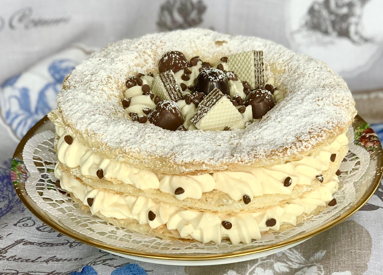 Come tutti gli anni per il mio compleanno la torta la faccio da me, assecondando i miei gusti e anche quelli dei miei cari. Niente torte pannose, niente bagne alcoliche, niente pasta di zucchero, niente canditi. E allora? Vado sul sicuro con la pasta sfoglia e una semplice e buonissima crema diplomatica con l’aggiunta di cioccolato.