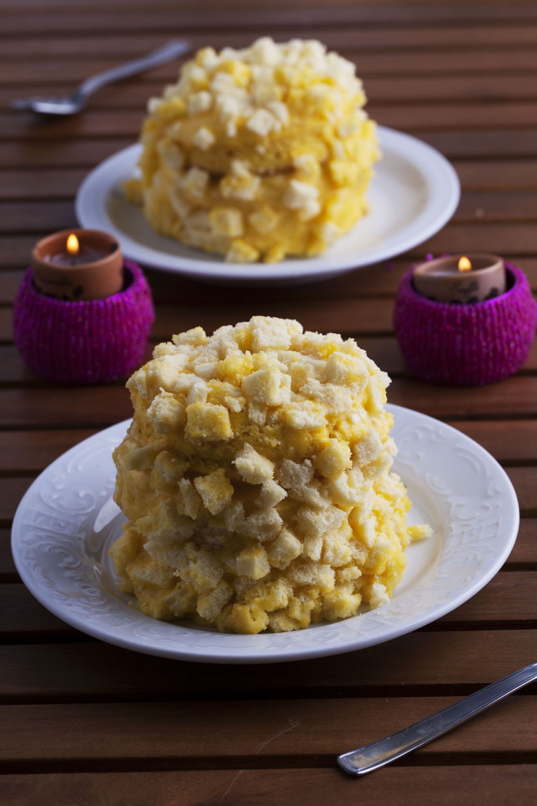 Ricavare dalle fettine di pan di Spagna avanzato dei dadini. Versare in un setaccio in modo da togliere le briciole. (In alternativa fate al contrario e usate solo le briciole come in altre versioni di Mimosa).