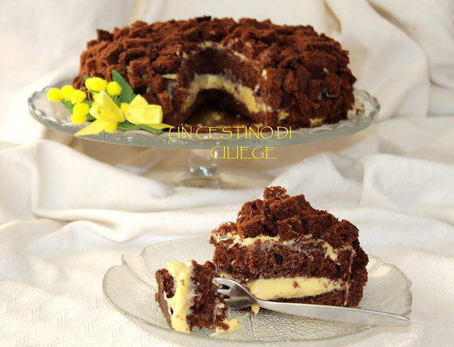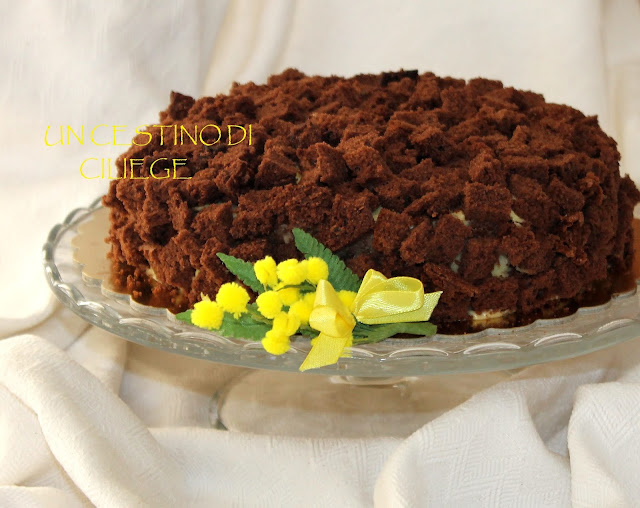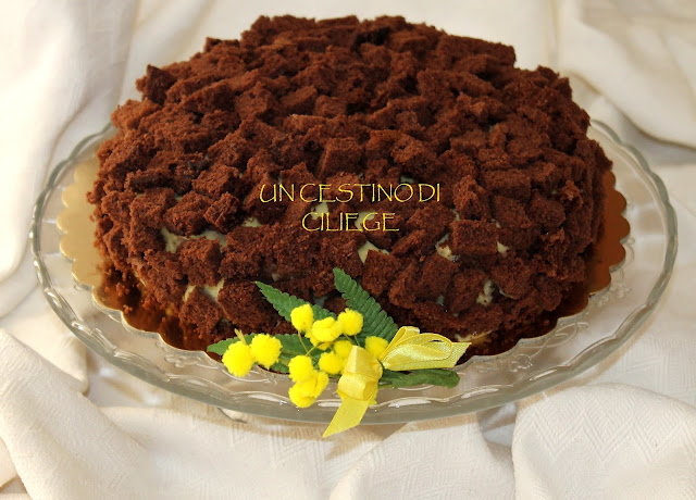 Torta mimosa al cacao, soffice e gustosa, aromatizzata con liquore ai mirtilli e farcita con