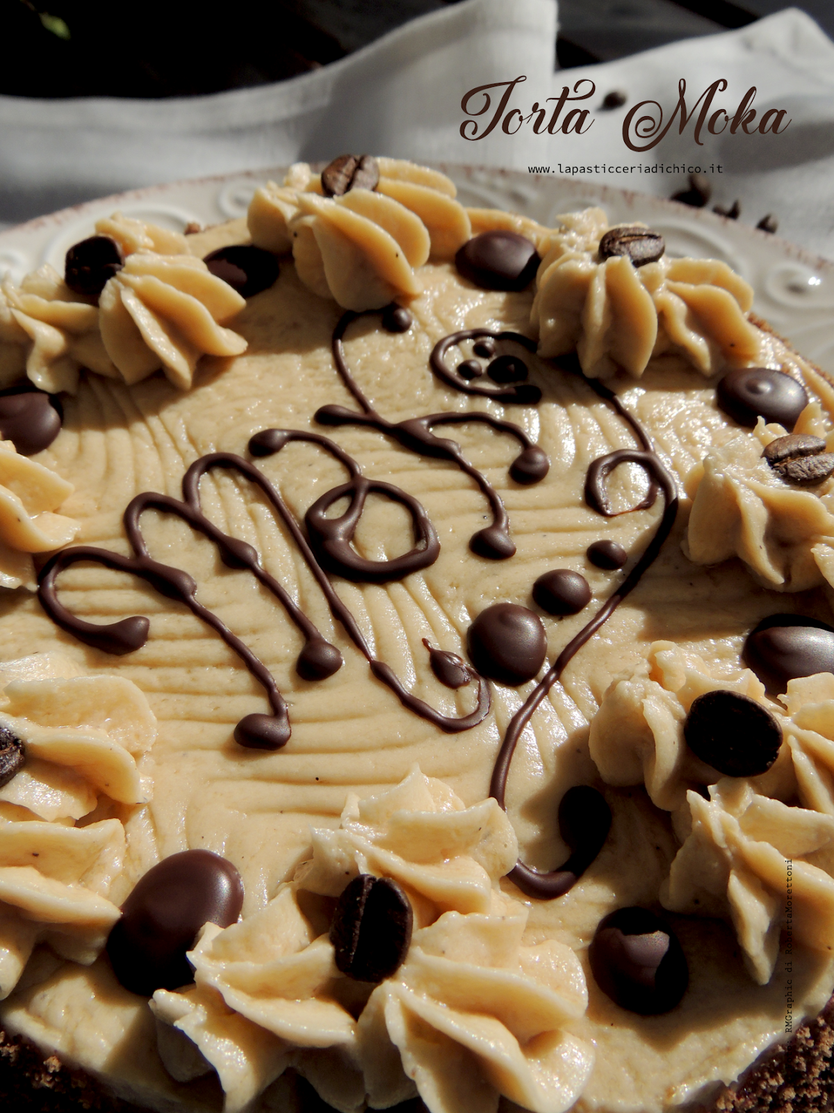 - Realizzate un cornetto di carta e metteteci all’interno il cioccolato fondente che a questo punto sarà sciolto, quindi scrivete Moka al centro della torta.