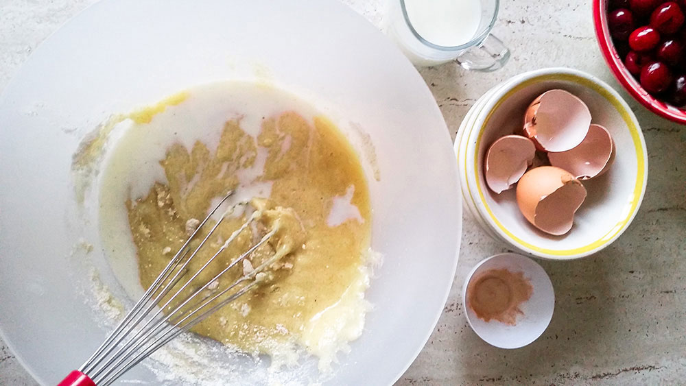 Disporre tutte le ciliegie denocciolate sul fondo. Versare la pastella nella teglia.