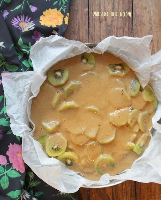 Avrete ottenuto un composto omogeneo e semi liquido che andrete ad aggiungere alla teglia farcita di kiwi. Livellate bene SBATTENDO leggermente la teglia sulla tavola.