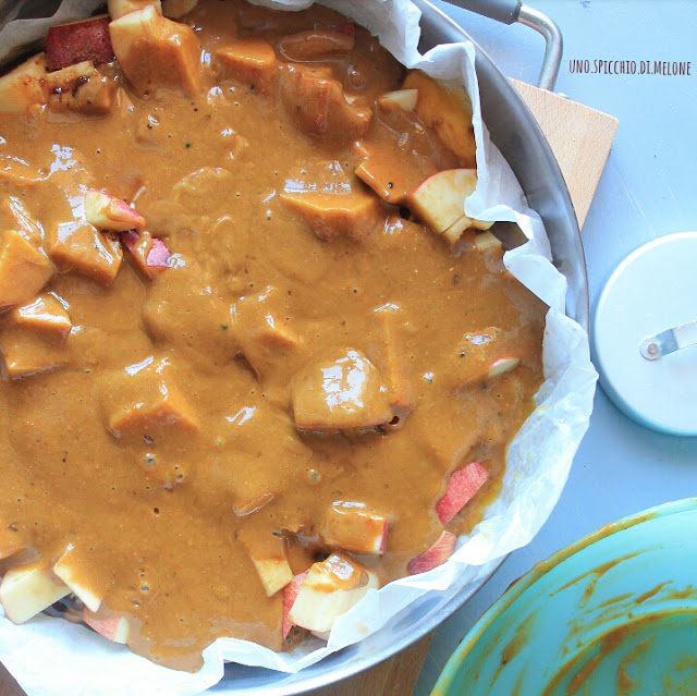 Versate il tutto nella teglia con le mele e mettete in forno preriscaldato a 200°C (MI RACCOMANDO, BEN CALDO) per circa 30/45 minuti
