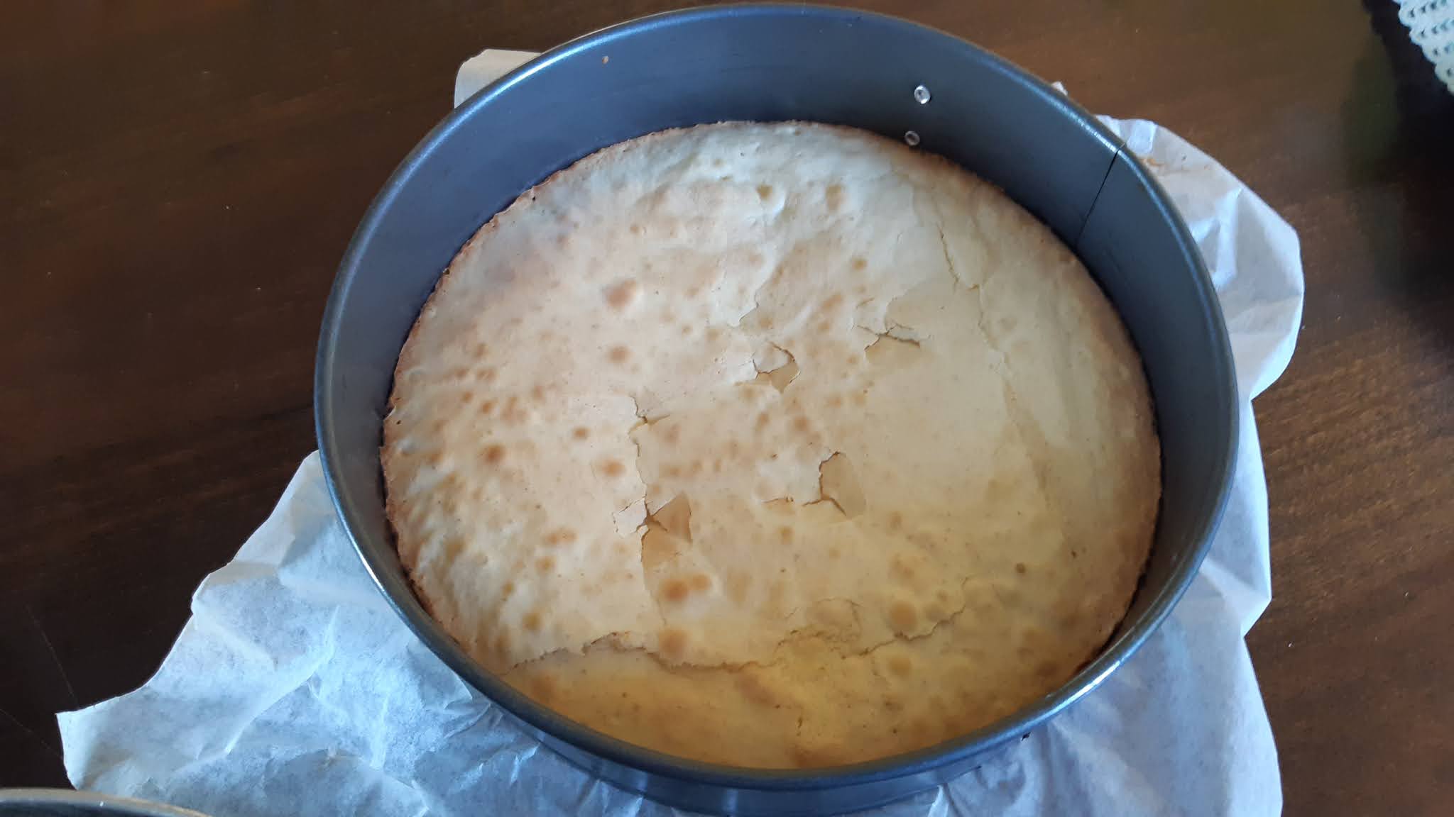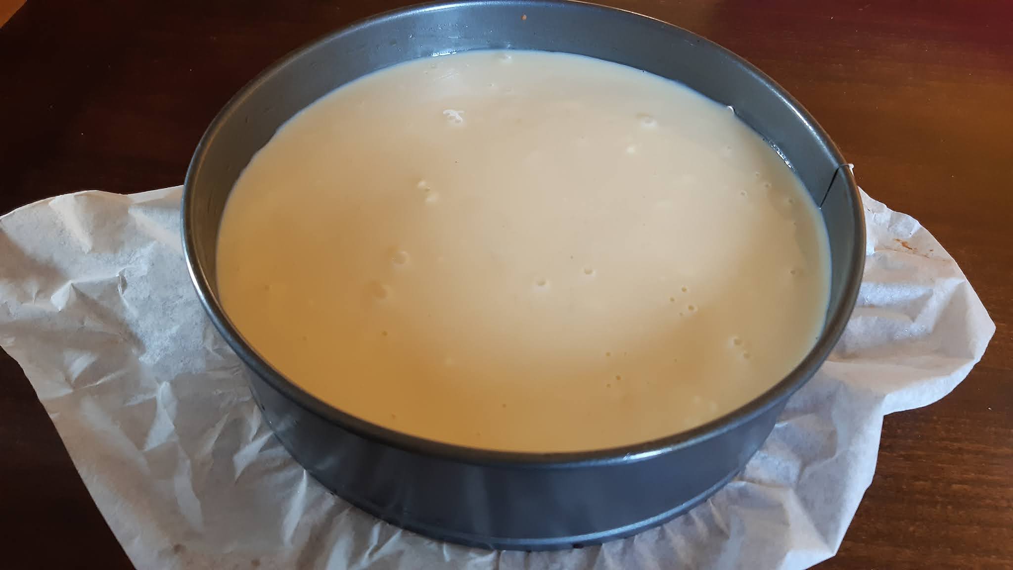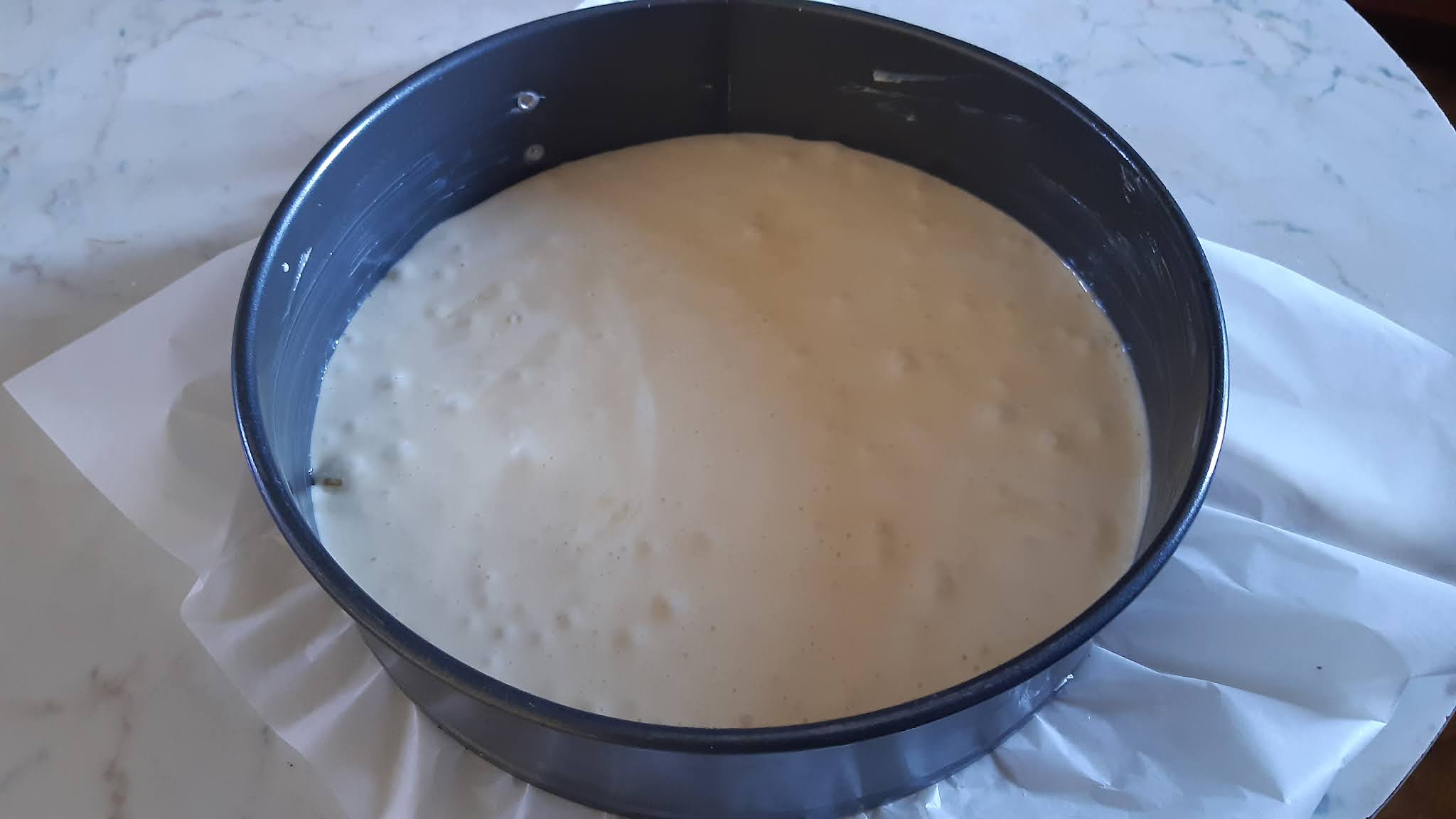 Rivestire con la carta forno una teglia rotonda con diametro 24 cm, versarvi l’impasto e infornare per il tempo indicato.